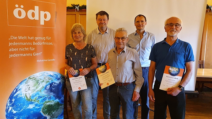 ÖDP-Kreisvorsitzender Matthias Baldauf freute sich bei der Kreishauptversammlung der ÖDP im Landkreis Regensburg langjährige und verdiente Mitglieder auszeichnen zu dürfen.